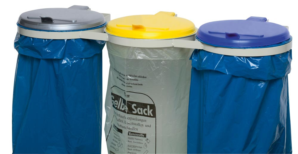 Abfallsammler 3-Fach, wandmont. eisenglimmer, Deckelsilber, gelb und blau Kunststoff, BxTxH 1200x510x70 mm