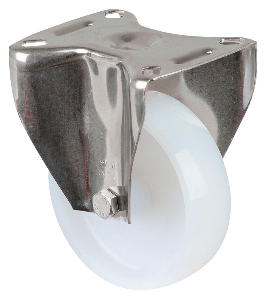 Edelstahl-Transportgeräte-Bockrolle, Kunststoff weiß, Durchm. 80 mm, Traglast 150 kg, Gleitlager, Anschraubplatte