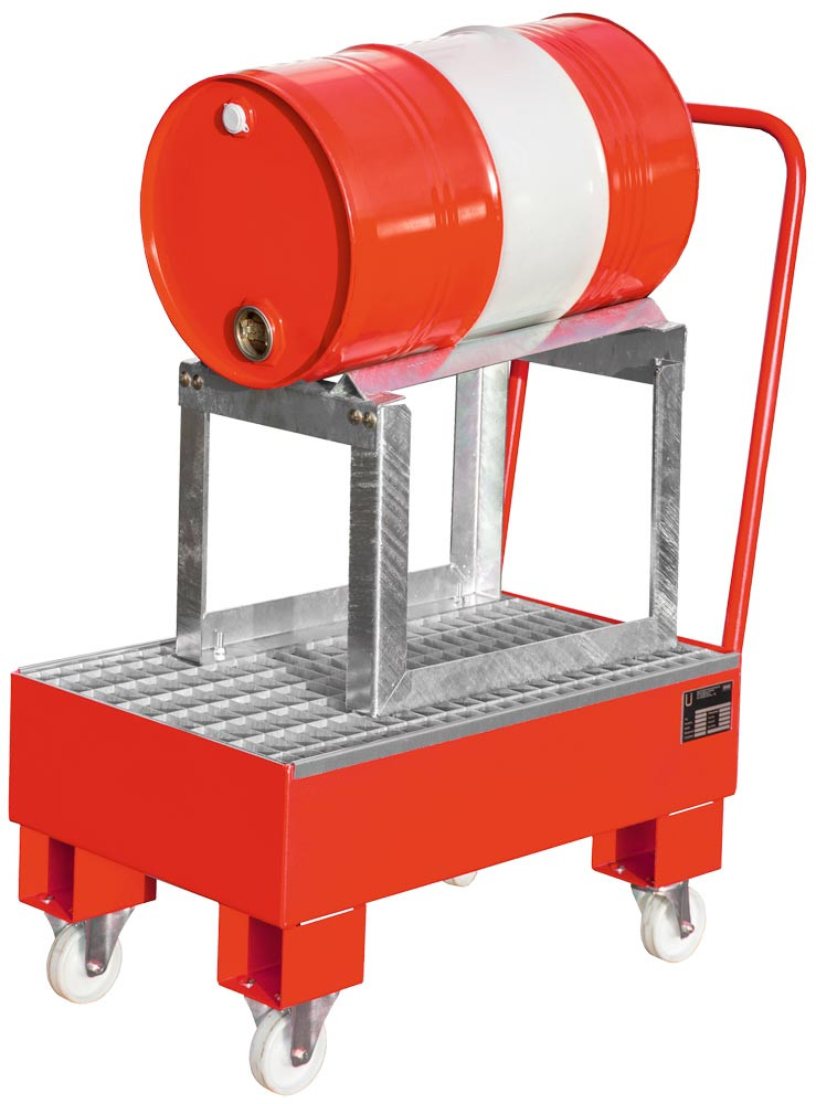 Fahrbare Auffangwanne für 1x60-l-Fass, 3 mm Stahlblech, liegend Lagern, BxTxH 940x500x1075 mm, Auffangvol. 61 l, RAL 5012 E6041853