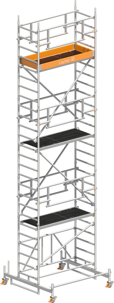 Fahrgerüst P2 mit Sicherheits-Doppelgeländer, Arbeitshöhe 7,76m, Gerüsthöhe 6,99m, Standhöhe 5,76m, Gewicht ohne Balast: 231,7 kg