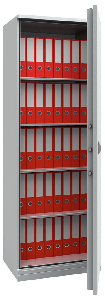 Feuergeschützter Büroschrank, BxTxH 670x500x1950 mm, 1 Tür, 4 Böden, Kapazität 40 Ordner, RAL 7035 lichtgrau