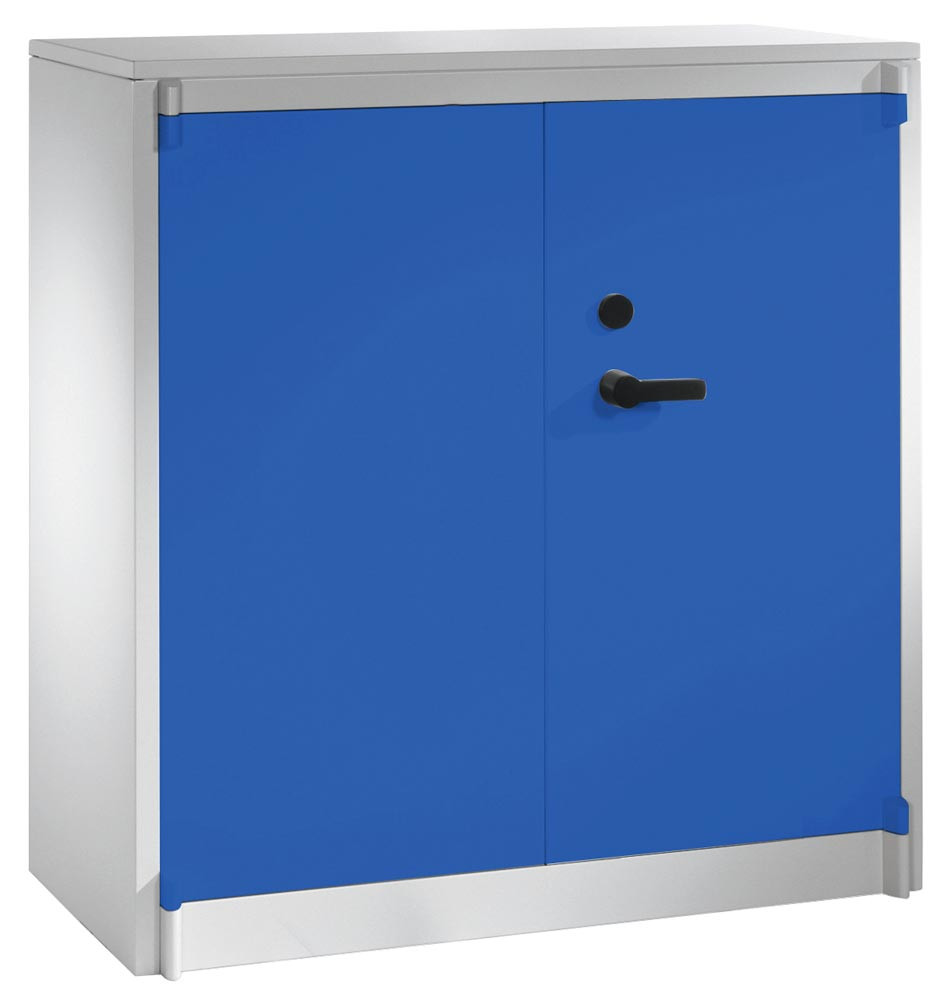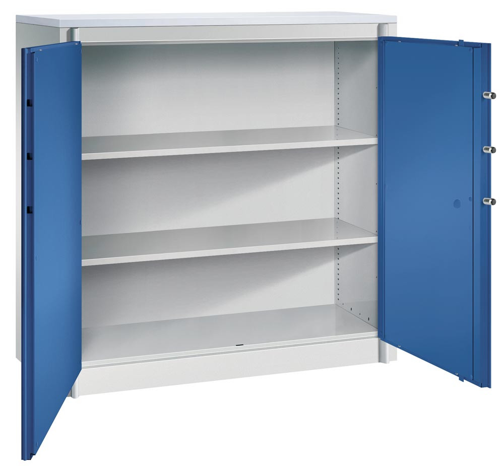Feuergeschützter Flügeltürenschrank, BxTxH 930x500x1950 mm, 2-türig, 4 Fachböden, RAL 7035/5010 lichtgrau/enzianblau E859383