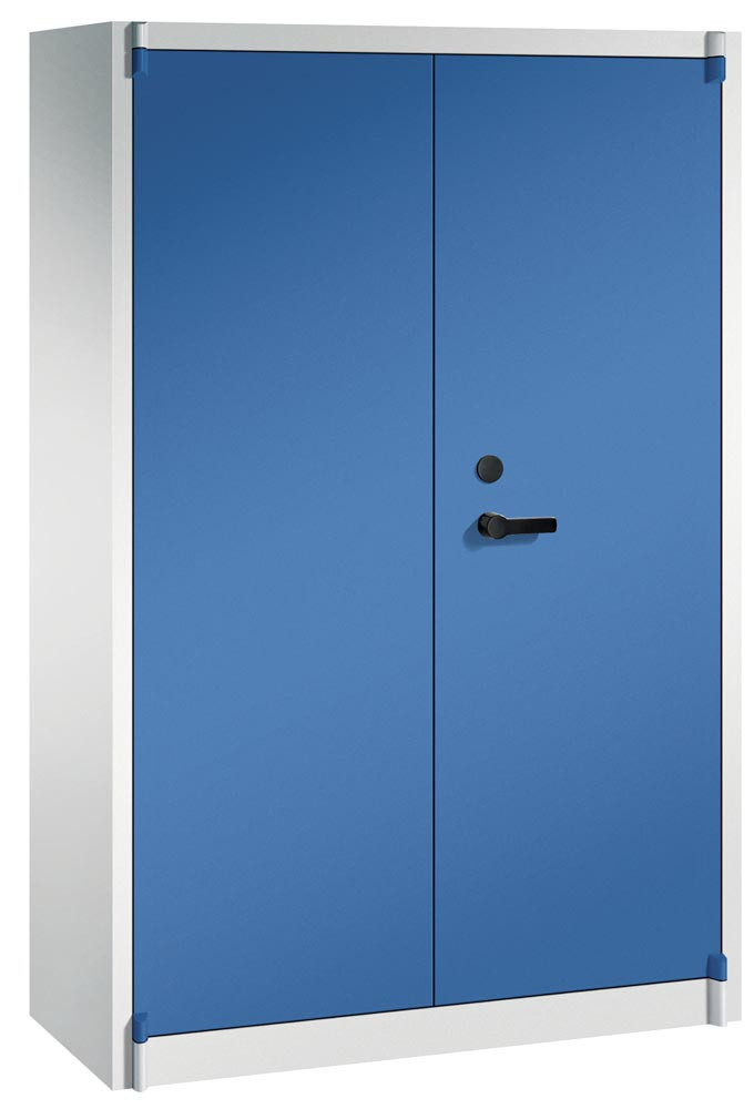 Feuergeschützter Flügeltürenschrank, BxTxH 1200x500x1950 mm, 2-türig, 4 Fachböden, RAL 7035/5010 lichtgrau/enzianblau