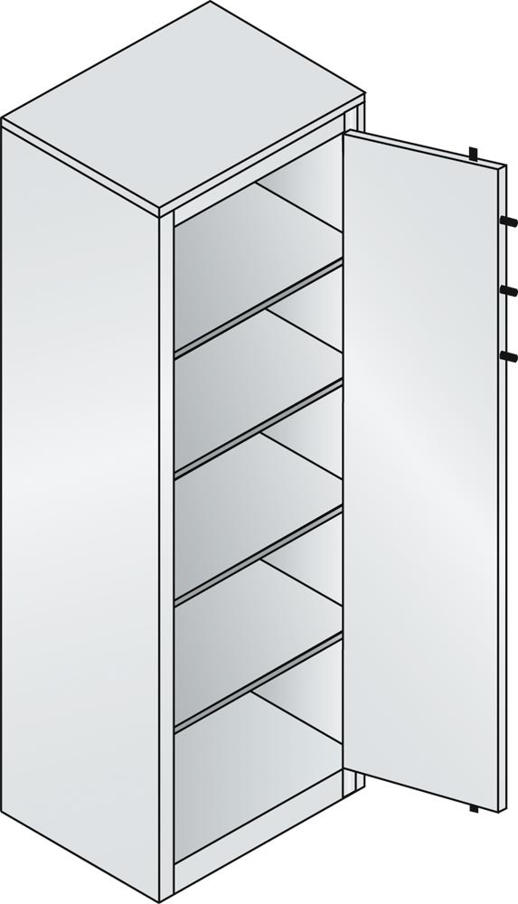 · Allseitig doppelwandig, zwischen den Wandungen 25 mm starke Spezial-Isolierplatten Klasse A1, nicht brennbar nach DIN 4102 · Flügeltüren lagern oben und unten in stabilen Drehbolzen · Links und rechts je 3 Sicherungsbolzen, die in die Seitenwände einrasten · 5-riegeliges Bolzenriegelwerk (seitlich 3 x, oben/unten je 1 x) · Doppelbart-Sicherheitsschloss mit 2 Schlüsseln · Schrankgriffe in schwarz · Traglast pro Einlegeboden ca. 70 kg (bei gleichmäßig verteilter Last) ∙ Halbhohe Schränke mit DBS-Abdeckplatte, lichtgrau