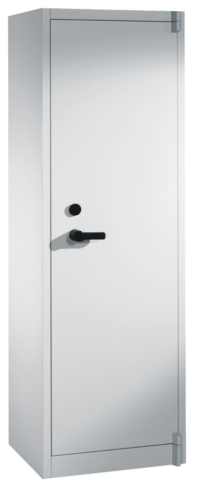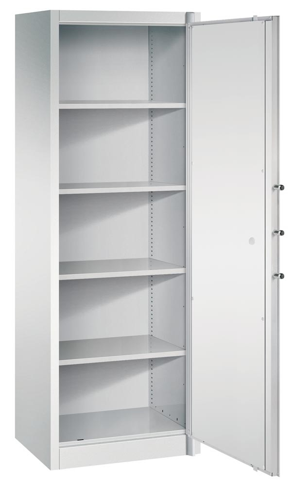 Feuergeschützter Flügeltürenschrank, BxTxH 650x500x1950 mm, 1-türig, 4 Fachböden, RAL 7035 lichtgrau