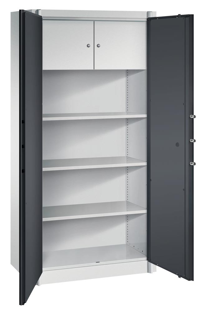 Feuergeschützter Flügeltürenschrank, BxTxH 930x500x1950 mm, 2-türig, 3 Fachböden, 2 Schließfächer, RAL 7035/7021 lichtgrau/schwarzgrau