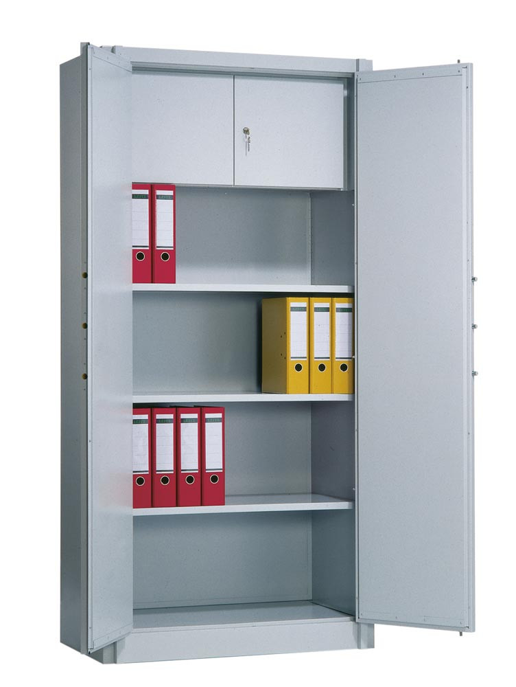· Allseitig doppelwandig, zwischen den Wandungen 25 mm starke Spezial-Isolierplatten Klasse A1, nicht brennbar nach DIN 4102 · Flügeltüren lagern oben und unten in stabilen Drehbolzen · Links und rechts je 3 Sicherungsbolzen, die in die Seitenwände einrasten · 5-riegeliges Bolzenriegelwerk (seitlich 3 x, oben/unten je 1 x) · Doppelbart-Sicherheitsschloss mit 2 Schlüsseln · Schrankgriffe in schwarz · Traglast pro Einlegeboden ca. 70 kg (bei gleichmäßig verteilter Last) ∙ Halbhohe Schränke mit DBS-Abdeckplatte, lichtgrau