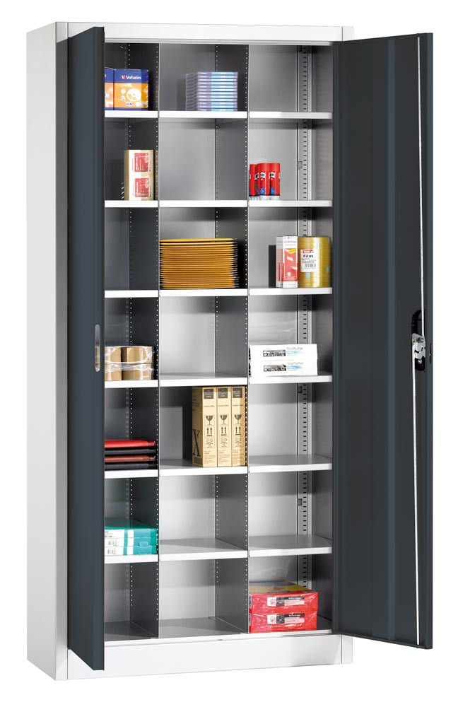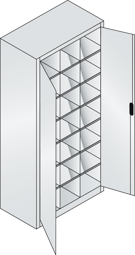 Flügeltürenschrank, BxTxH 930x400x1950 mm, 21 Fächer, Fachmaß BxTxH 280x365x240 mm, RAL 7035/7021 lichtgrau/schwarzgrau