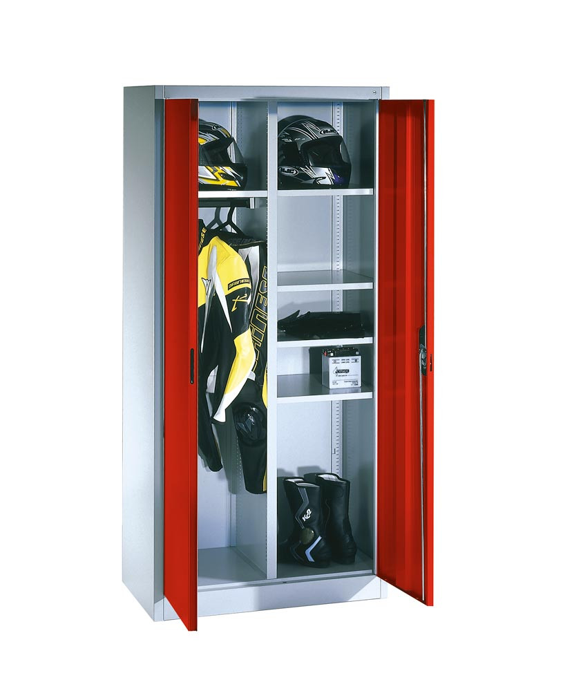 Flügeltürenschrank, BxTxH 930x500x1950 mm, links 1 Hutboden + 1 Kleiderstange, rechts 4 halbe Böden, RAL 7035/3003 lichtgrau/rubinrot
