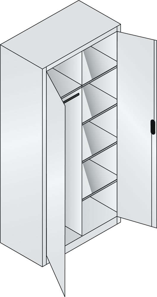 Flügeltürenschrank, BxTxH 930x500x1950 mm, links 1 Hutboden + 1 Kleiderstange, rechts 4 halbe Böden, RAL 7035/7021 lichtgrau/schwarzgrau