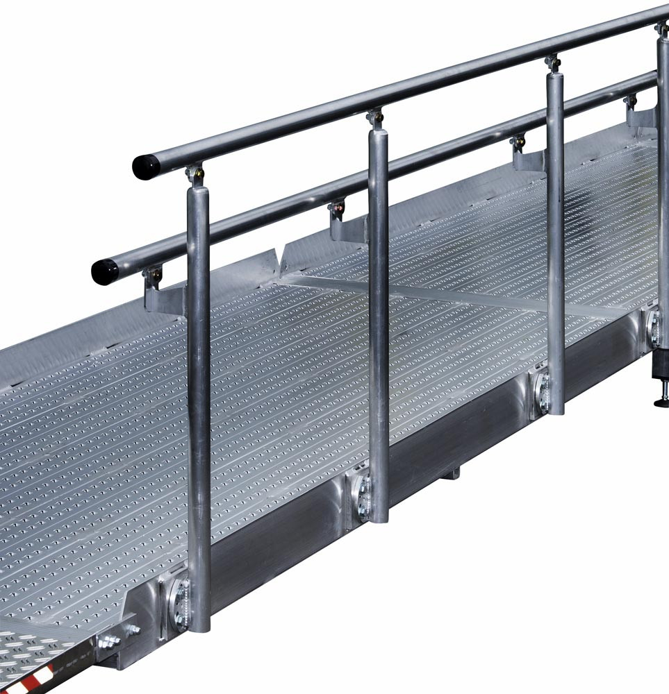 · Aus eloxiertem Aluminium · Auf 2 Höhen angebrachte, durchgehende Handläufe - Höhe 700 und 900 mm · Rechts oder links montierbar · Um bis zu 13° neigbar · Preis je Seite