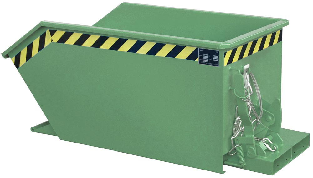 Mulden-Selbstkippbehälter, automatischer Aufrichter, Traglast 750 kg, LxBxH 1440x680x580 mm, Vol. 0,30 cbm, RAL 6011 resedagrün