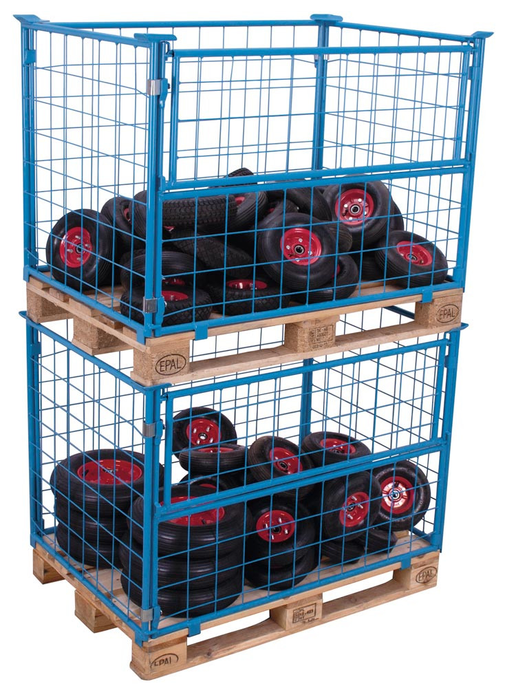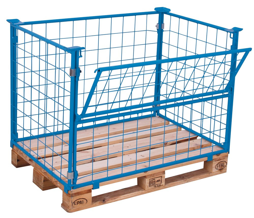 Palettenaufsatz, Höhe 800 mm, für Paletten 800x1200 mm, Auflast 1000 kg, RAL 5012 lichtblau, mit 3 festen und 1 halb abklappbaren Wand