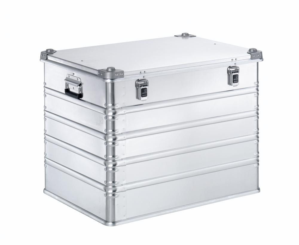 ∙ Aus Aluminium, 1 mm Blechstärke (ab 750 x 550 mm Grundmaß sogar 1,5 mm) · stapelbare Transportkisten mit vollverschweißtem Rand-, Deckel- und Bodenprofil · Umlaufende Sicken und Ecksicken für zusätzliche Formstabilität ∙ Federfallgriffe mit einer Eingriffbreite bis ca. 105 mm ∙ Deckel mit durchgängigem Edelstahlscharnier, zwei Gurtbändern und geschäumter Dichtung für Staub- und Spritzwasserschutz ∙ Klappverschlüsse, 54 mm breit mit Schlossvorbereitung