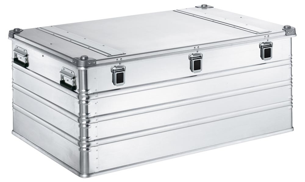 ∙ Aus Aluminium, 1 mm Blechstärke (ab 750 x 550 mm Grundmaß sogar 1,5 mm) · stapelbare Transportkisten mit vollverschweißtem Rand-, Deckel- und Bodenprofil · Umlaufende Sicken und Ecksicken für zusätzliche Formstabilität ∙ Federfallgriffe mit einer Eingriffbreite bis ca. 105 mm ∙ Deckel mit durchgängigem Edelstahlscharnier, zwei Gurtbändern und geschäumter Dichtung für Staub- und Spritzwasserschutz ∙ Klappverschlüsse, 54 mm breit mit Schlossvorbereitung