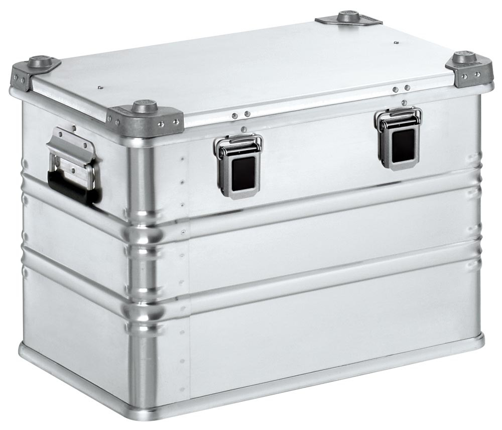 ∙ Aus Aluminium, 1 mm Blechstärke (ab 750 x 550 mm Grundmaß sogar 1,5 mm) · stapelbare Transportkisten mit vollverschweißtem Rand-, Deckel- und Bodenprofil · Umlaufende Sicken und Ecksicken für zusätzliche Formstabilität ∙ Federfallgriffe mit einer Eingriffbreite bis ca. 105 mm ∙ Deckel mit durchgängigem Edelstahlscharnier, zwei Gurtbändern und geschäumter Dichtung für Staub- und Spritzwasserschutz ∙ Klappverschlüsse, 54 mm breit mit Schlossvorbereitung