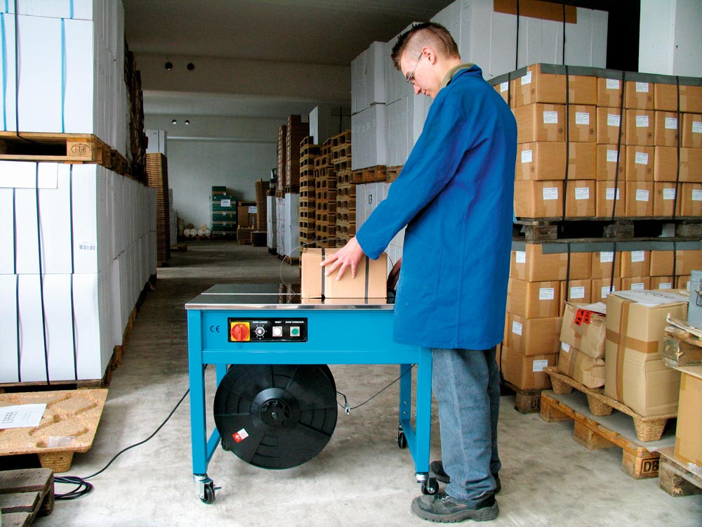 ∙ Fahrbarer Packtisch ohne Bandführungsrahmen ∙ Zur Umreifung runder und eckiger Packstücke in verschiedenen Größen ∙ Niedriger Energieverbrauch, Abschaltautomatik ∙ Die Maschine ist werksseitig auf 12 mm Bandbreite eingestellt